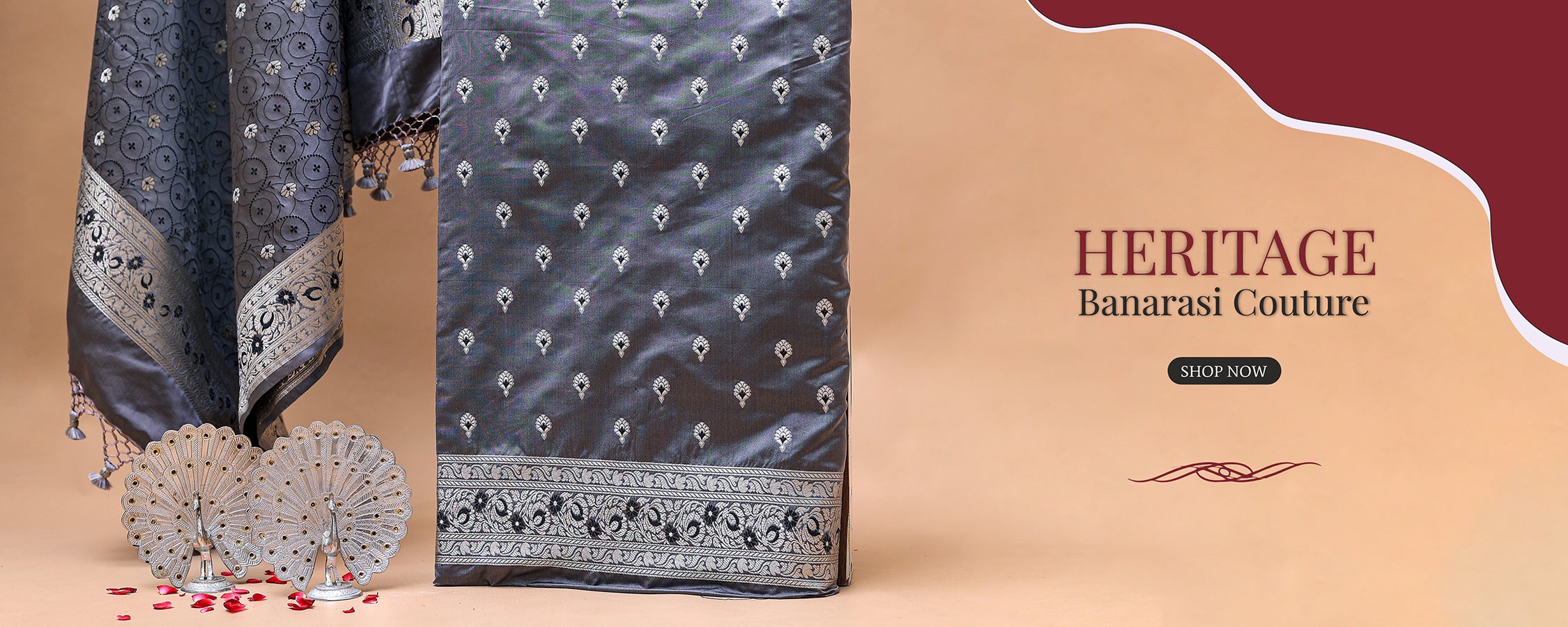 Sage Grey Varanasi Brocade Silk Kurta And Double Panel Tissue Dupatta With Handwork