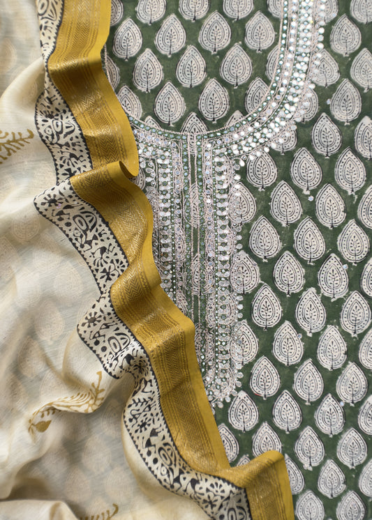 Mehndi Green - Sanganeri Block Printed Natural Dyed Ajrakh Suit In Chanderi