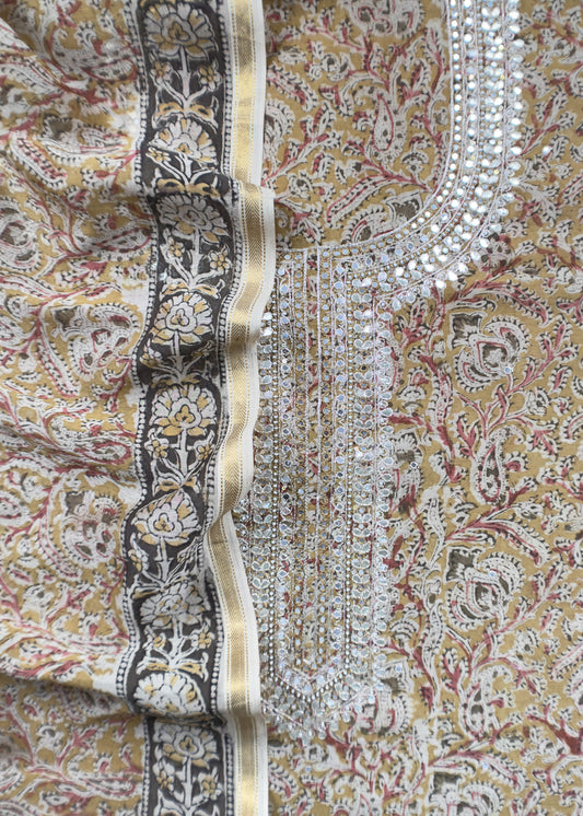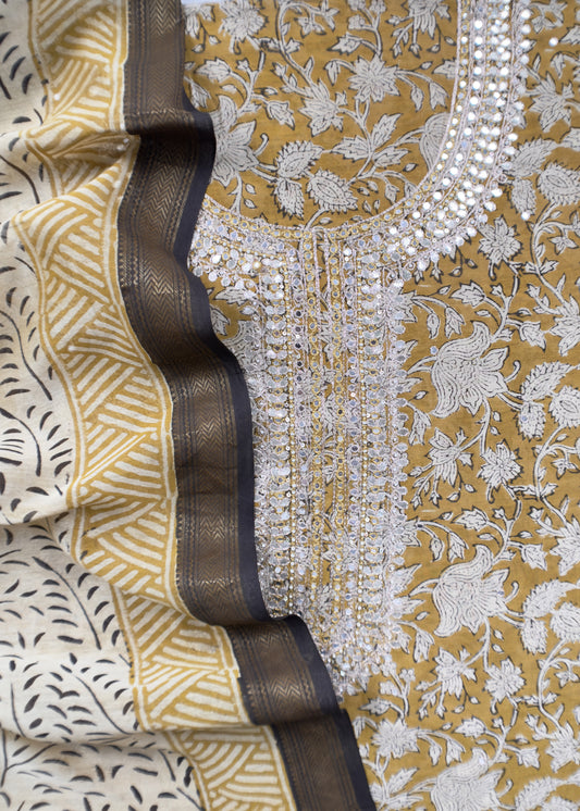 Yellow Sanganeri Block Printed Natural Dyed Ajrakh Suit In Chanderi