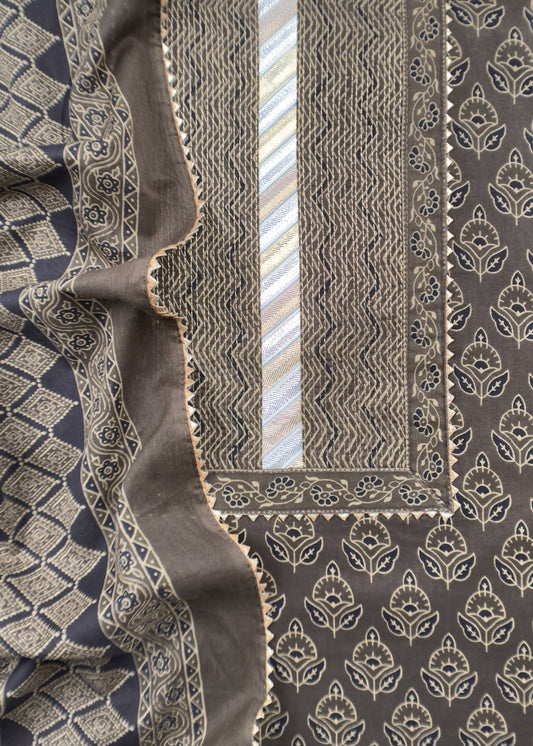 Black Ajrakh Hand Block Unstitched Suit In Pure Modal