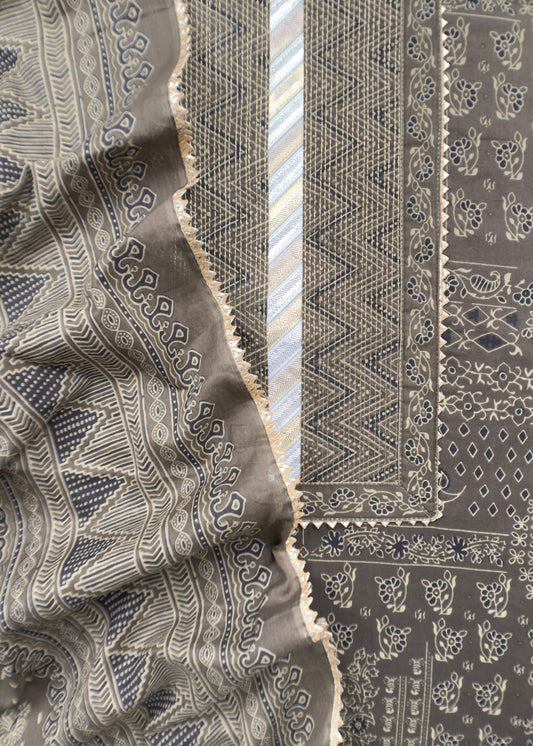 Black- Sanganeri Block Printed Natural Dyed Ajrakh Suit In Chanderi