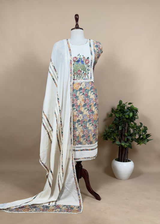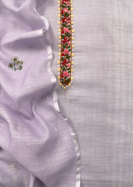 Powder Purple Linen Deer Suit Fabric With Kantha Hand Embroidery