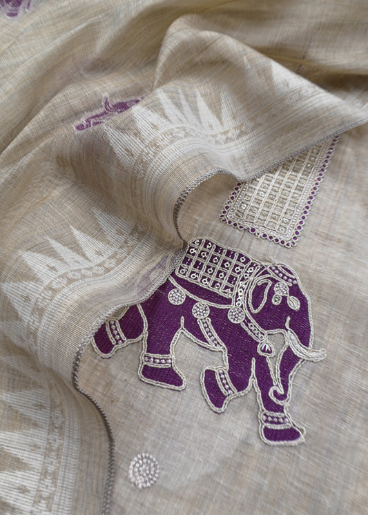 Purple Pure Linen Haathi Embroidered Suit With Jamdani Weaving