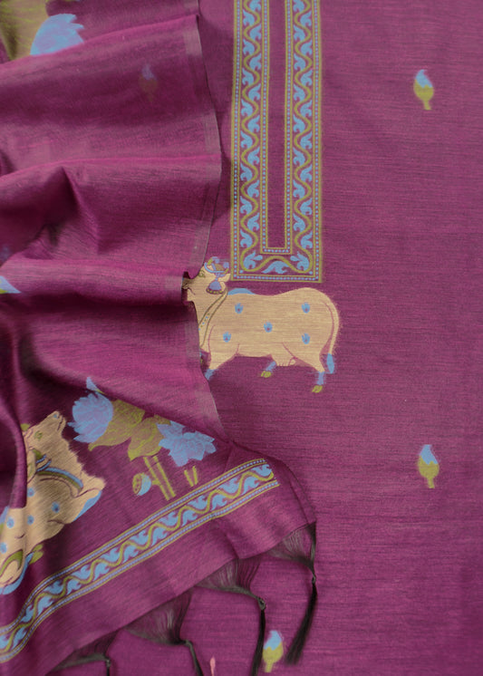 Purple Wine Unstitched Chanderi Dupatta-Suit With Pichwai Jamdani Weaving