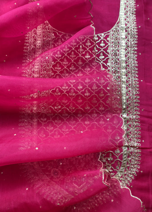 Rani Pink Silk Unstitched Suit With Pitta Work