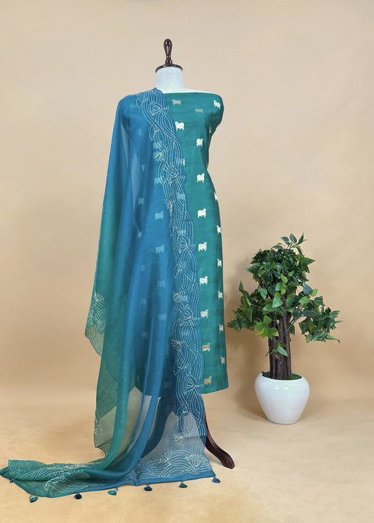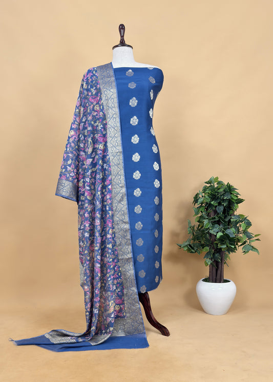 Rangreza Bandhej Blue Handloom Gajji Silk Suit With Weaving And Gota Patti Handwork