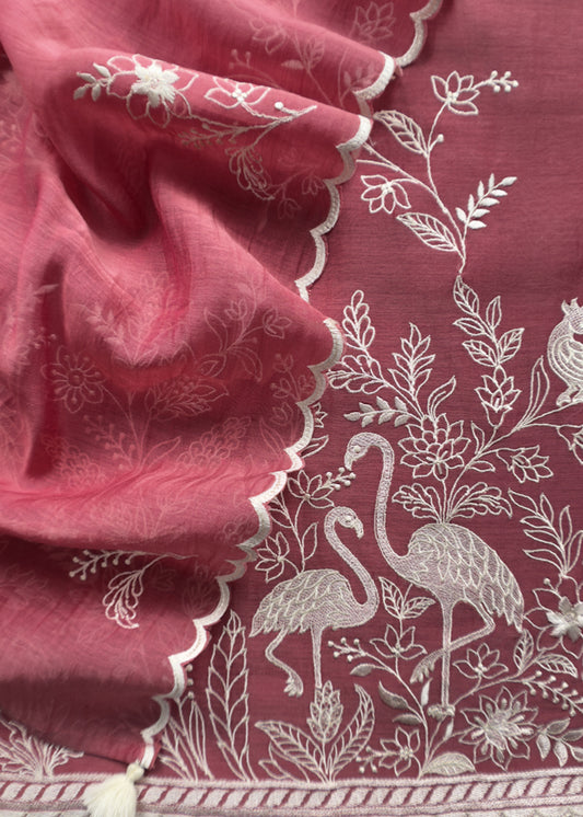 Rani Pink Mul Chanderi Suit With Flamingo And Peacock Embroidery