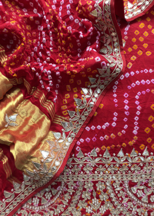 Rangreza Bandhej Red Handloom Gajji Silk Suit With Weaving And Gota Patti Handwork