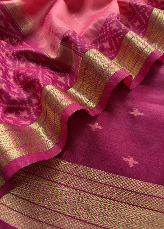 Rani Pink Chanderi Blend Ikkat Suit Set With Zari borders