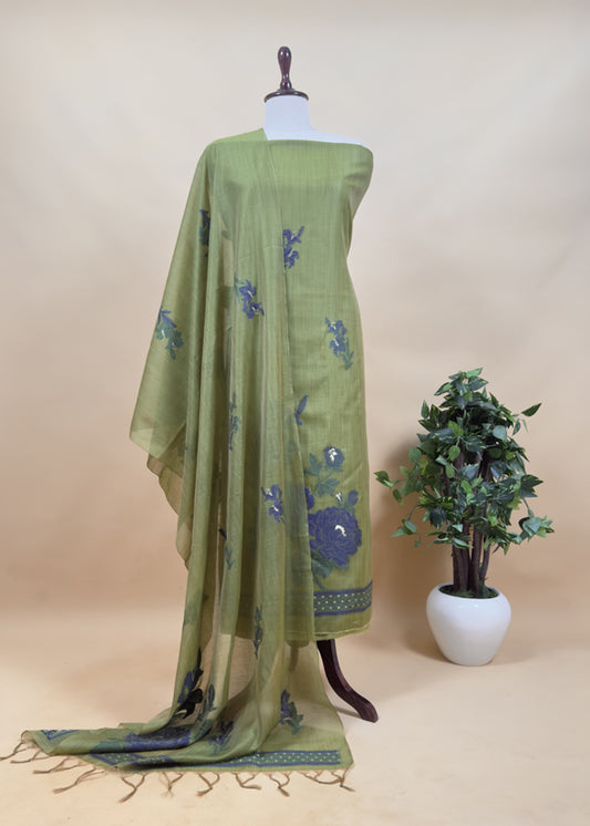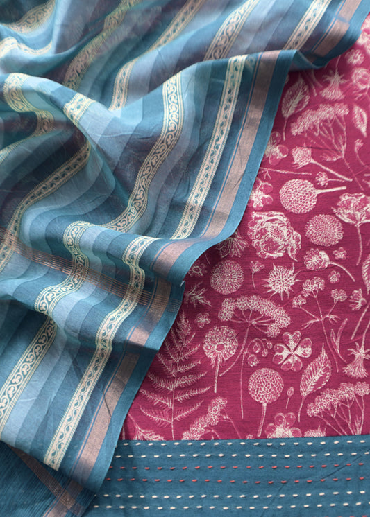 Red And Green Block Print Handloom Maheshwari Silk Suit With Kantha Work