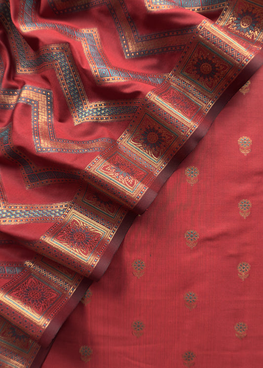 Red Abstact Print Maheshwari Silk Suit With Gold Zari weaving
