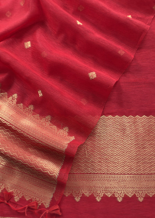 Red Chanderi Unstitched suit with Gold zari Jamdani weaving
