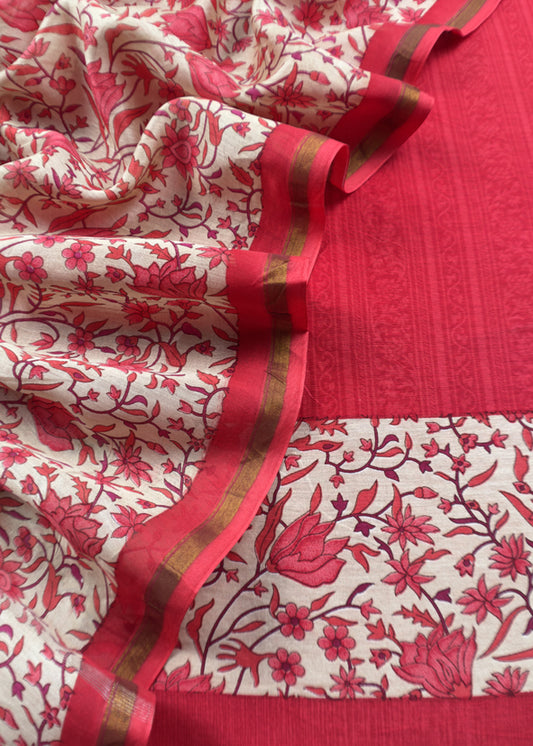 Red Block Print Pure Maheshwari Silk Suit With Floral Print Dupatta