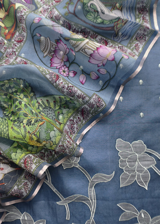 Royal Blue Pure Organza Suit with Rose Tissue Appliqué Work and Pichwai dupatta