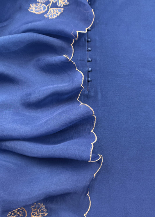 Royal Blue Satin Silk Unstitched Suit With Kani Weaving