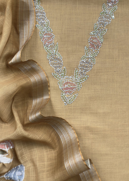 Summer mustard linen unstitched suit fabric with Kantha Hand Embroidery