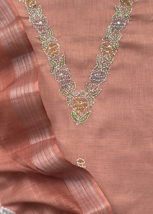 Summer Peach Linen Unstitched Suit Fabric With Kantha Hand Embroidery