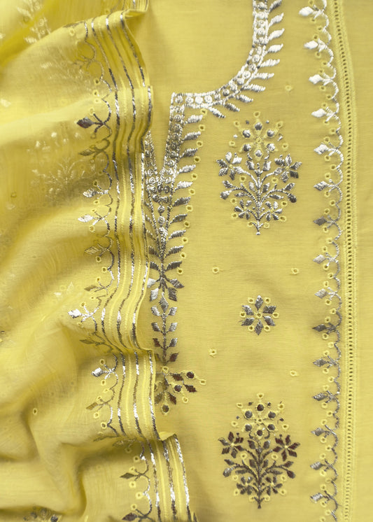 Sunflower Yellow Kora Silk Suit Fabric With Dori And Dabka Embroidery
