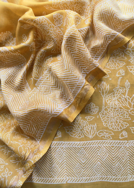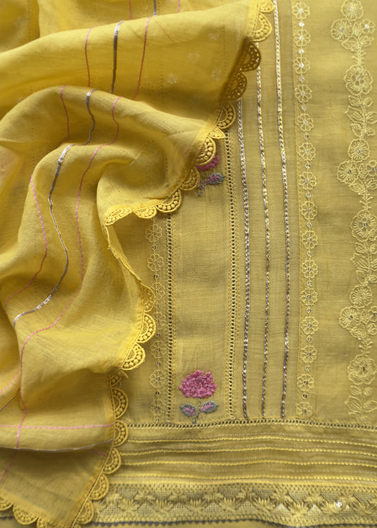 Sunshine Yellow Handloom Mul Chanderi Suit With Gold Pitta Hand Work And Embroidery