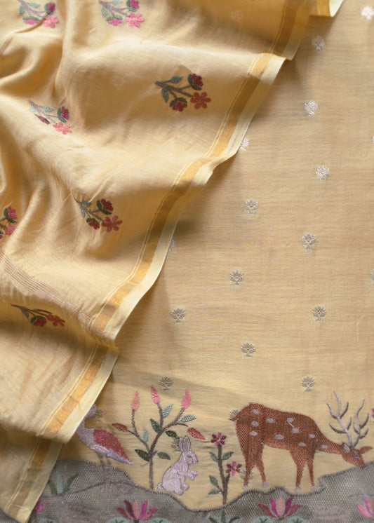 Summers Light Yellow Mul Chanderi Banarasi Suit With Resham Embroidery