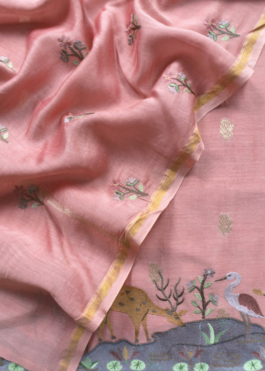 Summers Light Pink Mul Chanderi Banarasi Suit With Resham Embroidery