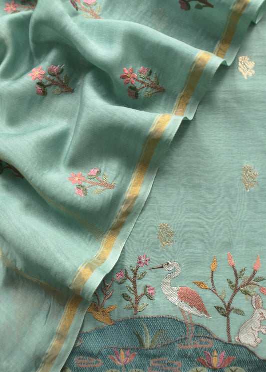 Summers Aqua Green Mul Chanderi Banarasi Suit With Resham Embroidery