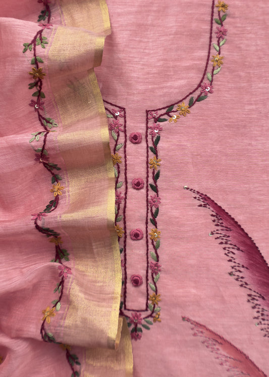 Taffy Pink Handloom Linen Silk Hand painted Suit Fabric with French knot and Kantha Handwork