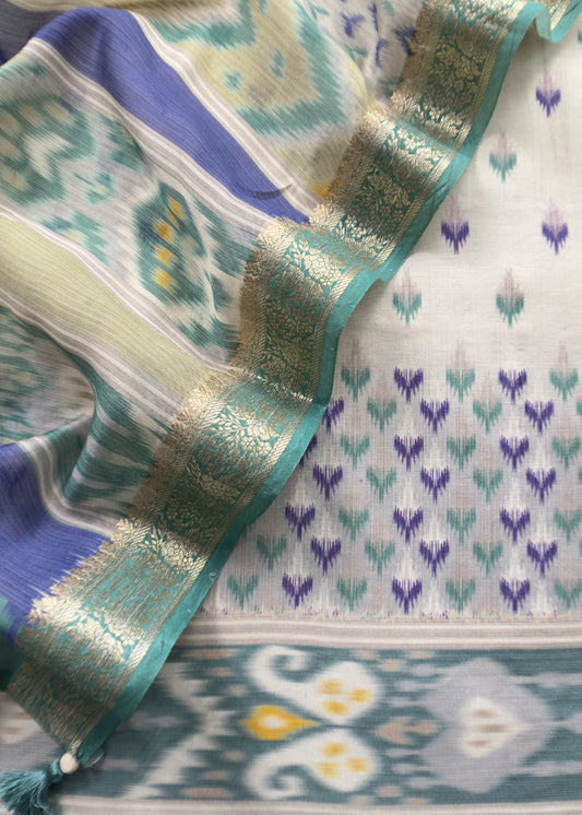 Teal Green Handloom Ikkat Chanderi Suit Fabric With Maheshwari Border
