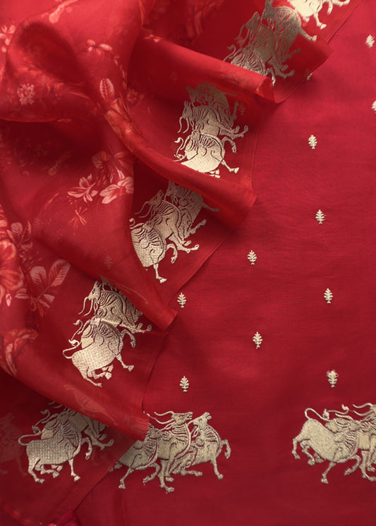 The Red Sikhagarh Handloom Organza Silk Suit With Floral Dupatta And Zari Embroidery