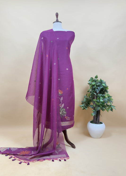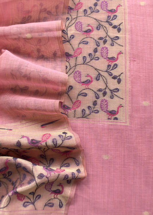 Taffy Pink Mor Paithani Style Jamdani weaving Suit in Linen Chanderi fabric