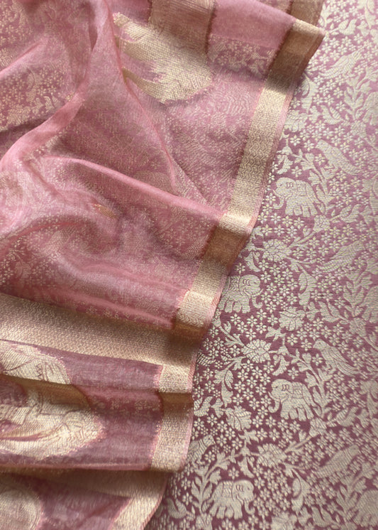 Taffy Pink Pure Mulmul Suit Fabric With Gold Tissue Silk Appliqué Work