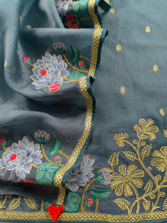 Teal Blue Kora Silk Suit With Gold Zari And Lotus Bharwa Embroidery