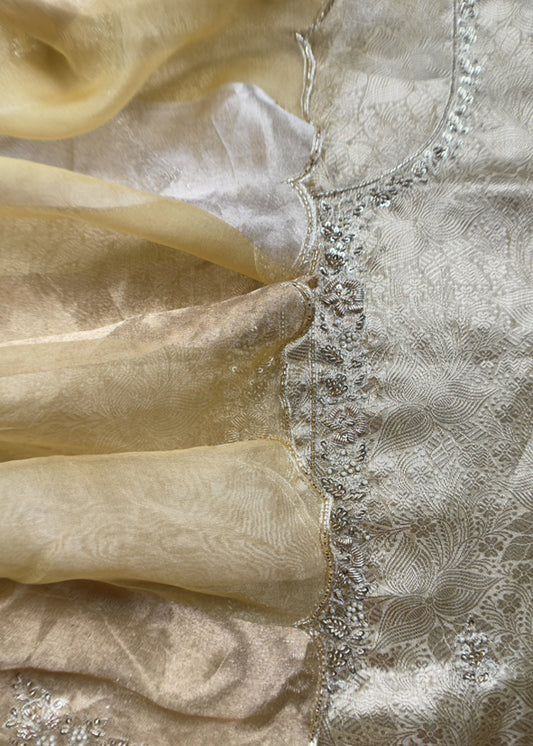Yellow Gold Varanasi Brocade Silk Kurta And Double Panel Tissue Dupatta With Handwork
