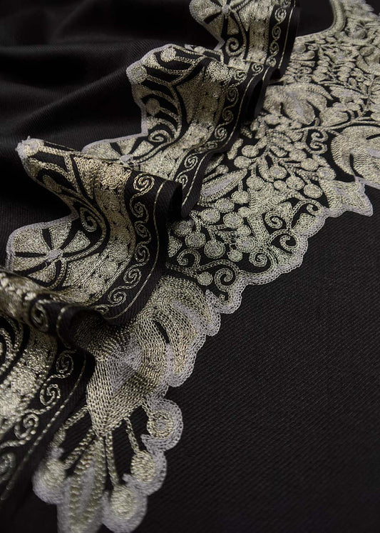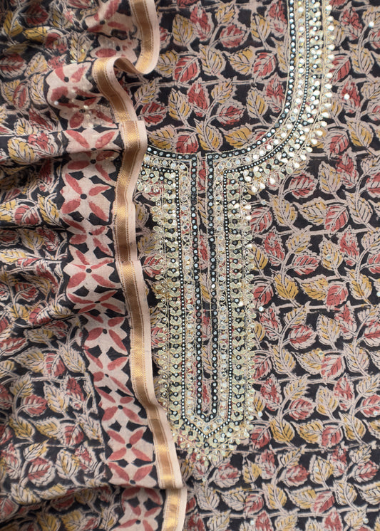 Block Print Handloom Maheshwari Silk Unstitched Dupatta-Suit With Kantha Embroidery
