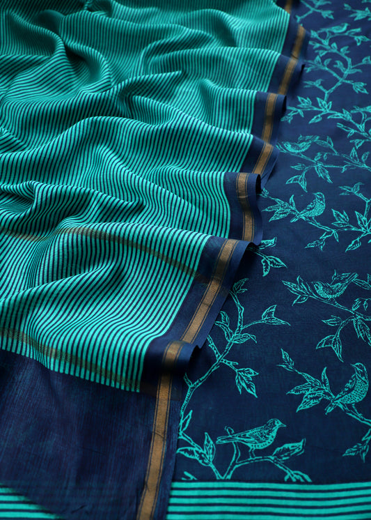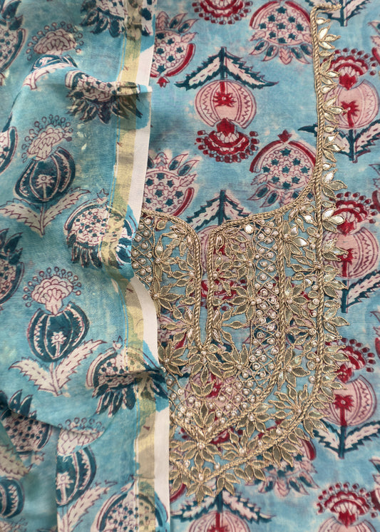 Block Print Maheswari Silk Suit With Blue Dupatta