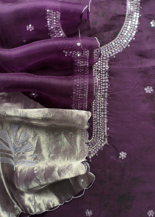 Violet Handloom kora Silk Suit with Mirror Handwork And Embroidery