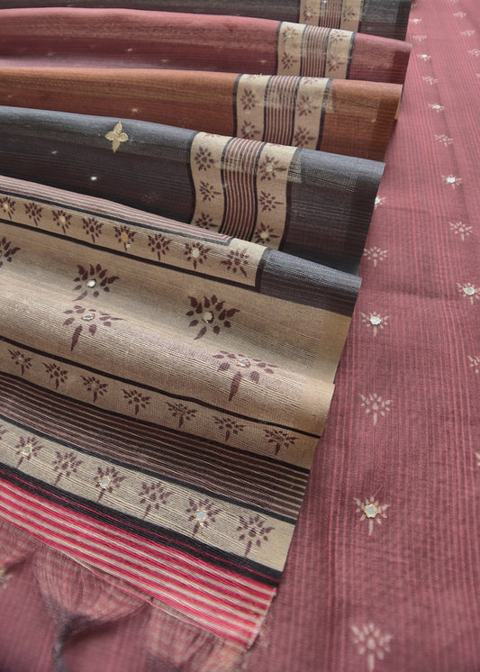 Wine Handloom Maheshwari Silk Suit With Hand Block Print