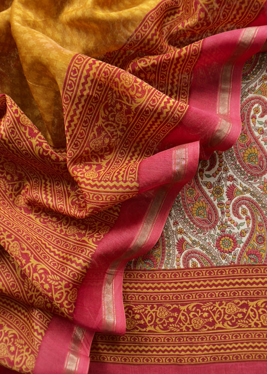 Yellow and Red Paisley Block Print Pure Maheshwari Silk Unstitched Suit