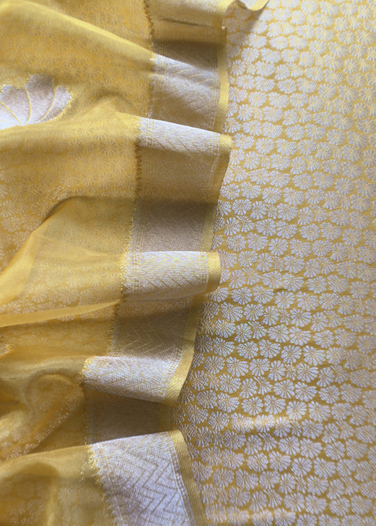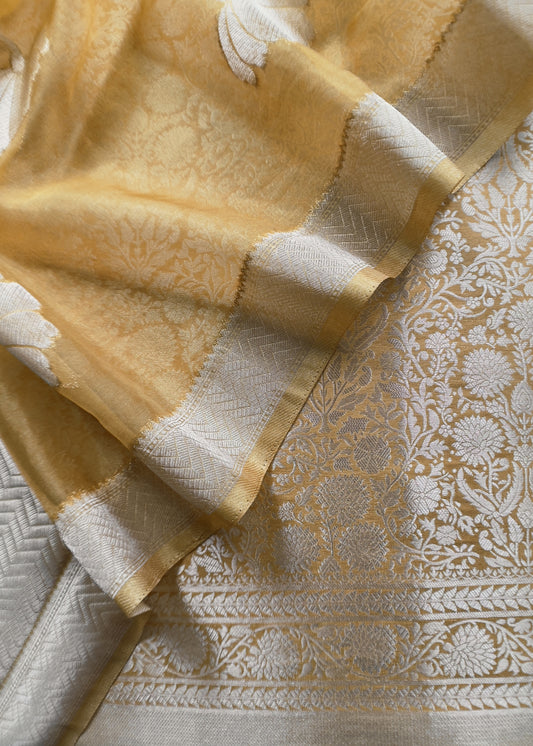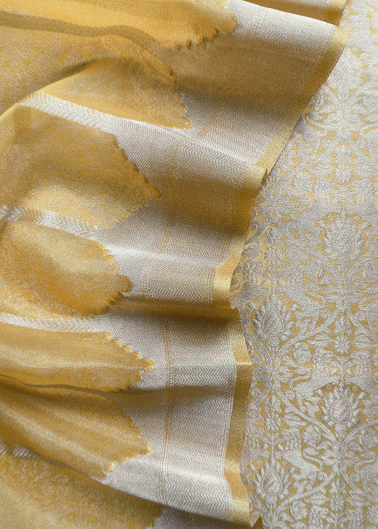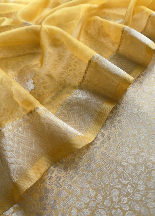 Yellow Banarasi Silk Brocade Suit With Organza Dupatta