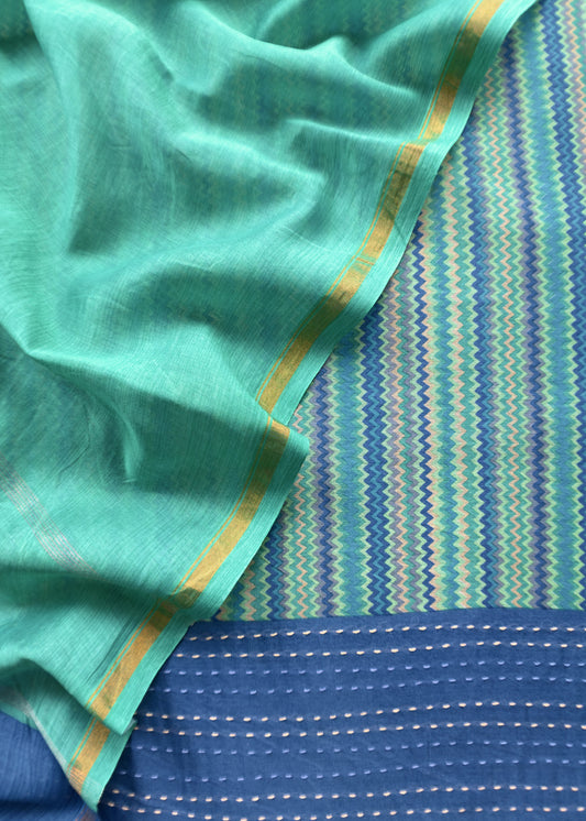 Blue And Green Pure Maheshwari Silk Suit With Kantha Handwork