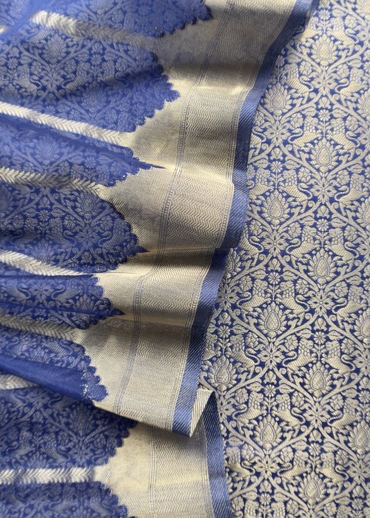 Blue Banarasi Silk Brocade Suit With Organza Dupatta