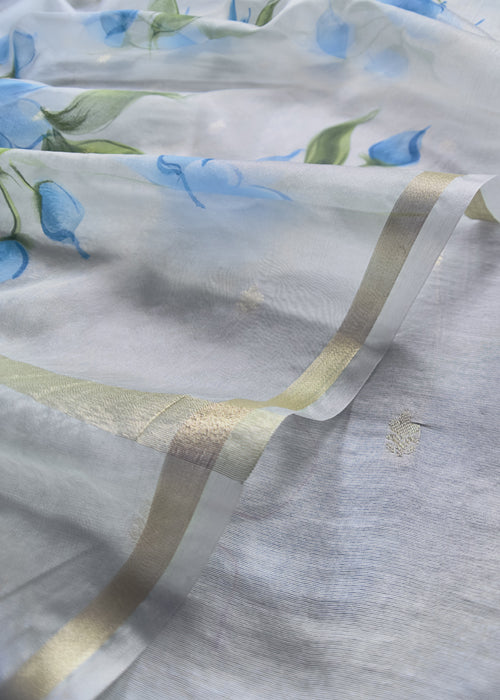 Blue Banarasi Suit With Hand-Painted Organza Dupatta