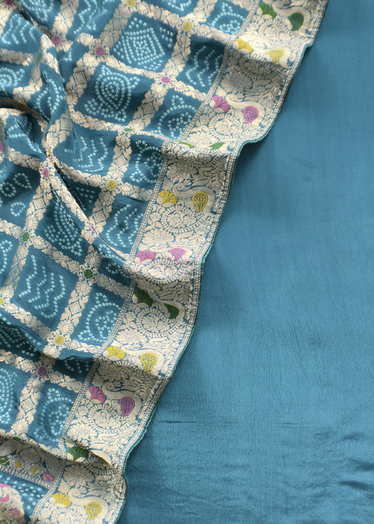 Blue Crepe Unstitched Suit With Banarasi Bandhej Dupatta