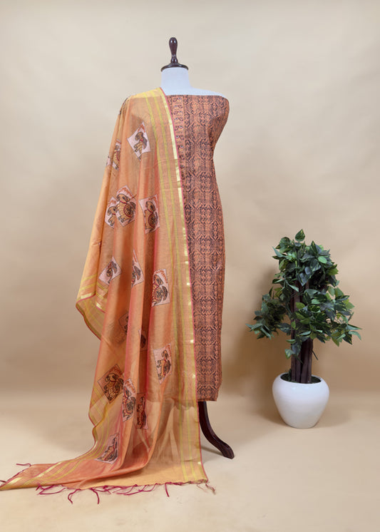 Blue Hand Blocked Print Chanderi Suit Fabric With Jamdani Dupatta
