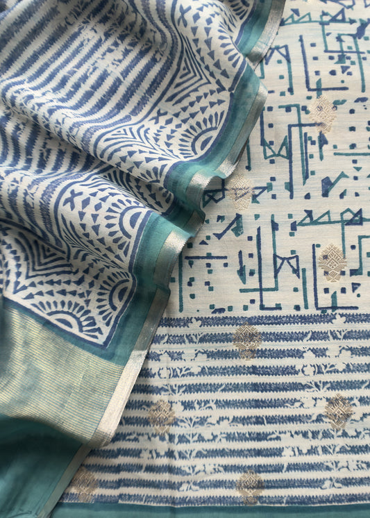 Blue Grey Handblock Handloom Chanderi With Zari Weaving