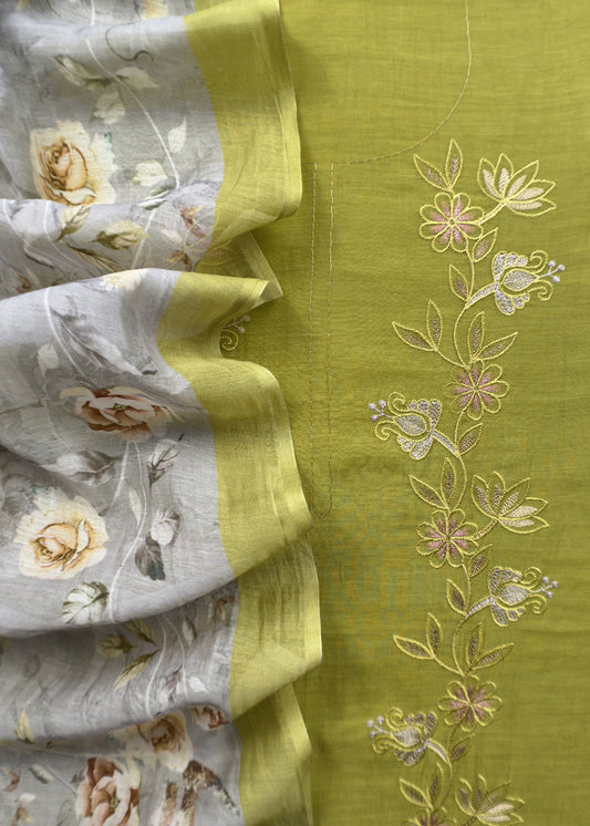 Apple Green Handloom Chanderi Embroidered Unstitched Suit With Digital Print