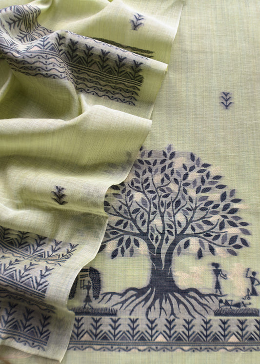 Apple Green Linen Chanderi Suit Fabric With Traditional Jamdani Weaving