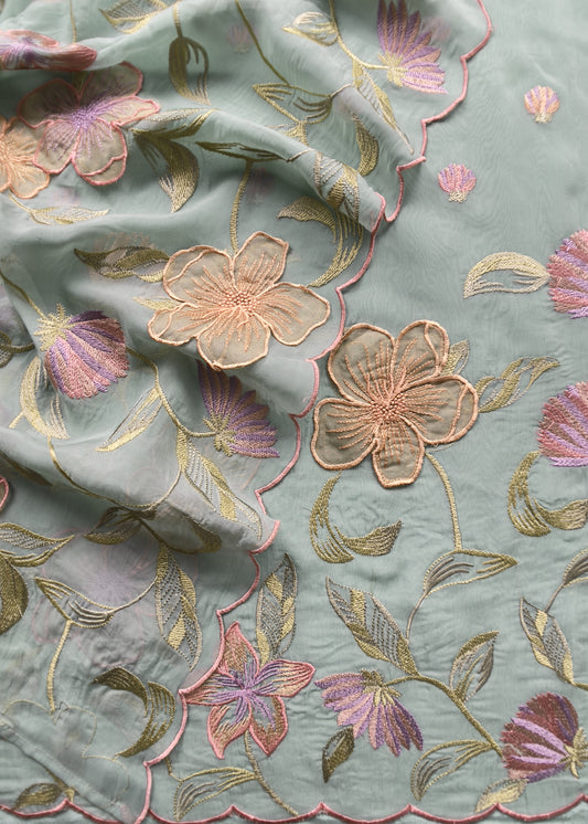 Blue Handloom Organza Silk Suit Fabric With Macaw Kantha Handwork