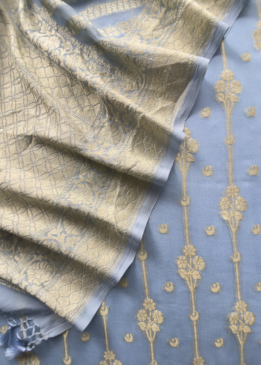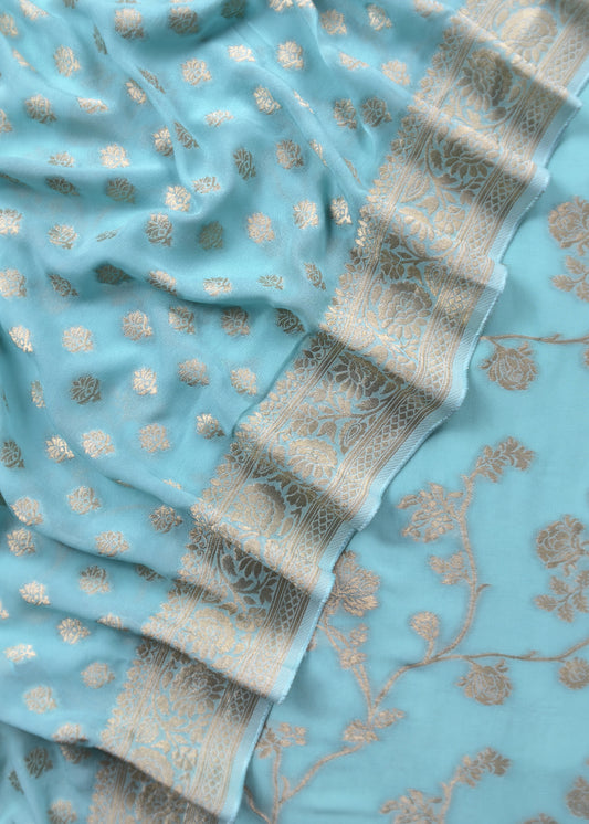 Blue Handloom Chiffon Suit Fabric With Zari Weaving Cutwork