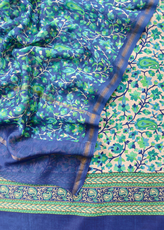 Blue Handloom Maheshwari Silk Unstitched Suit with Kalamkari Dupatta